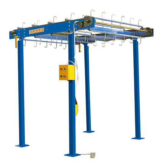 中空玻璃铝间隔框吊挂输送机是中空玻璃制作过程中,铝间隔框经丁基胶涂布机涂胶后,对涂胶后的铝间隔框进行存放、输送的专用设备。